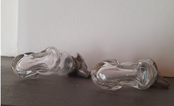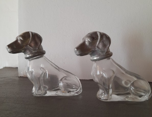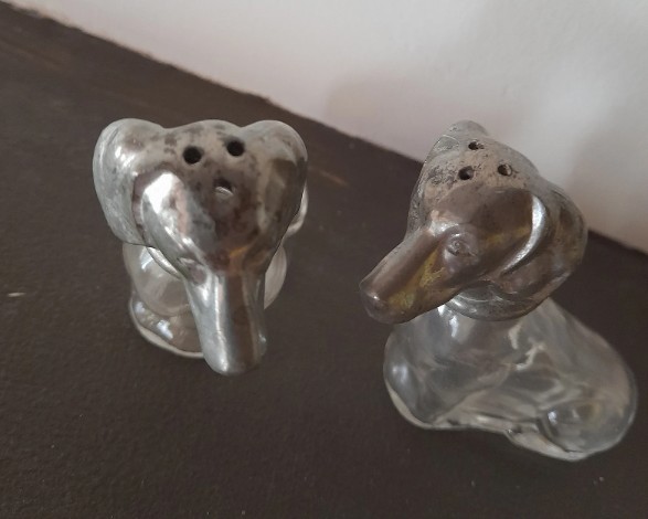 Paire de salières vintage en verre, en forme de teckel (chien), vraiment adorables !